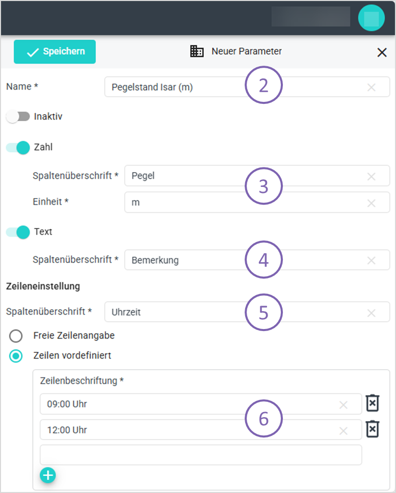 Es werden vordefinierte Zeilenbezeichnungen (z. B. „Uhrzeit“) als Spaltenname festgelegt. (5)