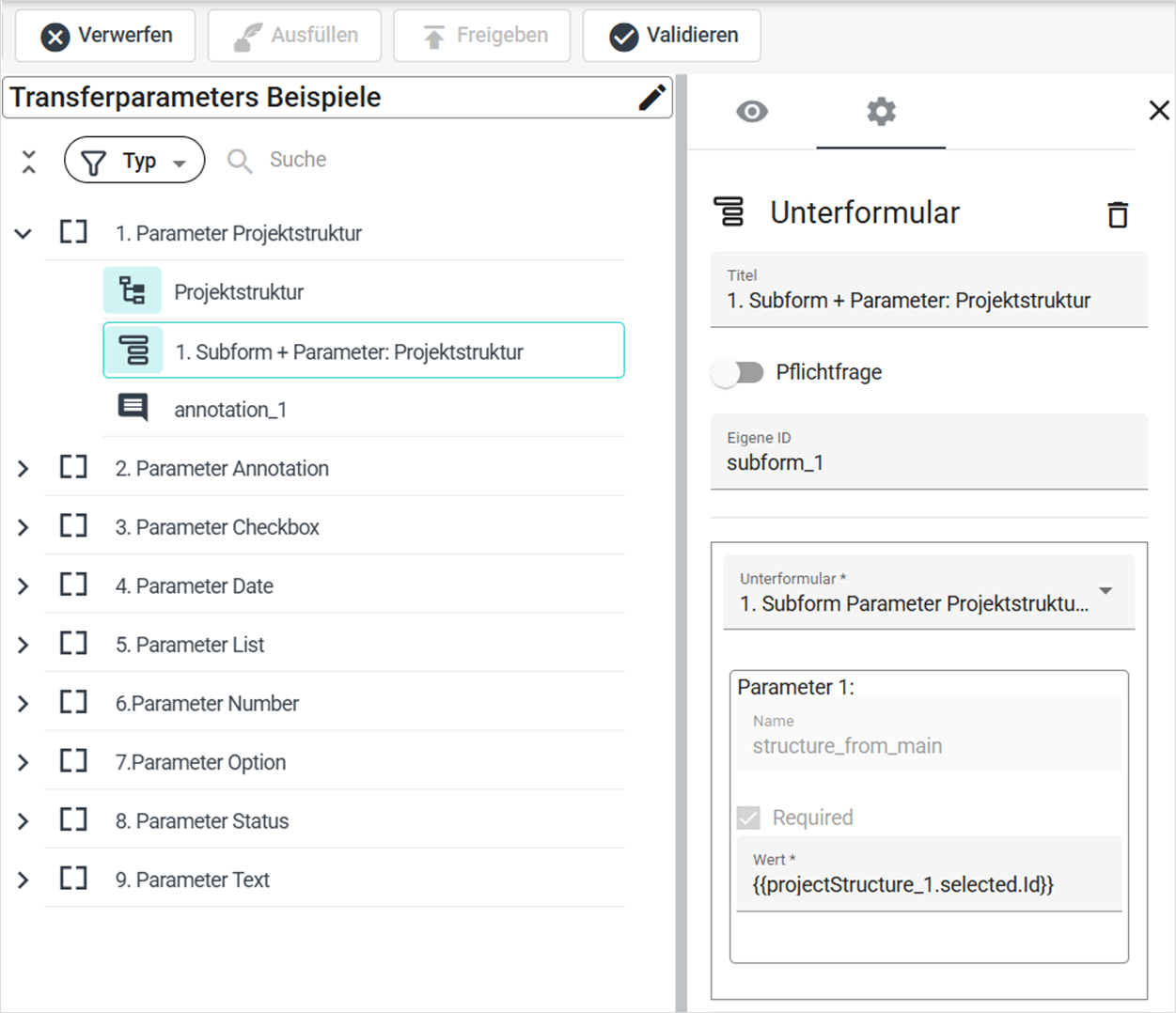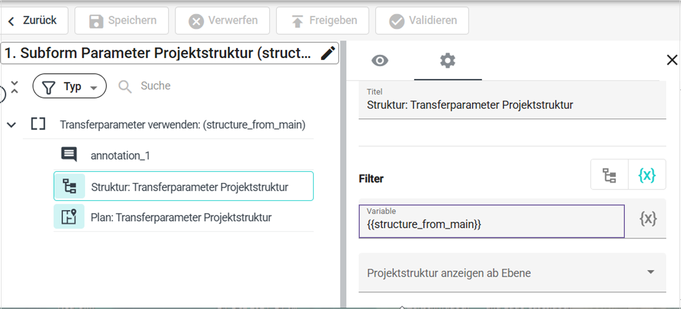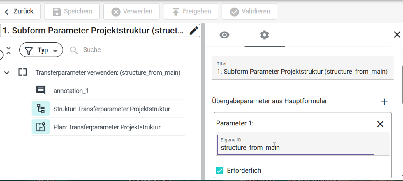 Mit Transferparametern können Daten aus dem Hauptformular – wie z. B. die Projektstruktur – an ein Unterformular übergeben werden. Damit dies funktioniert, muss der Parameter im Unterformular vorbereitet und im Hauptformular zugewiesen werden.