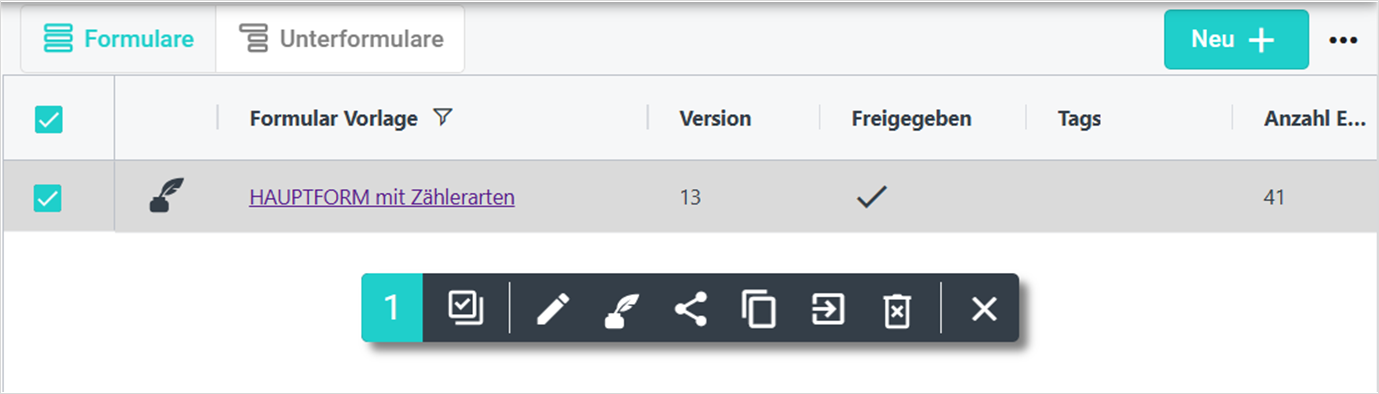 Sobald ein Formular per Checkbox ausgewählt wird, erscheint die MSB mit den verfügbaren Aktionen – wie gewohnt nutzbar, jetzt jedoch übersichtlicher und einheitlicher im Handling.