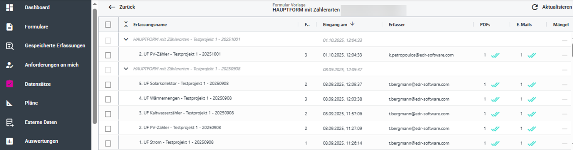 Neu ist die Darstellung in einer Tabellenansicht, in der die Erfassungen inklusive ihrer Zugehörigkeit (Haupt- und Unterformulare) übersichtlich dargestellt werden.