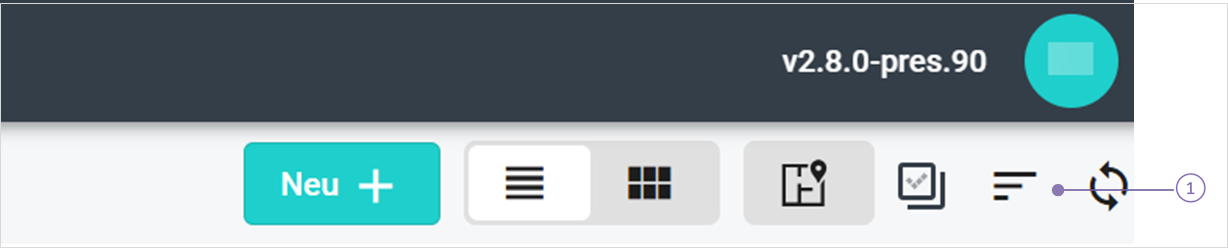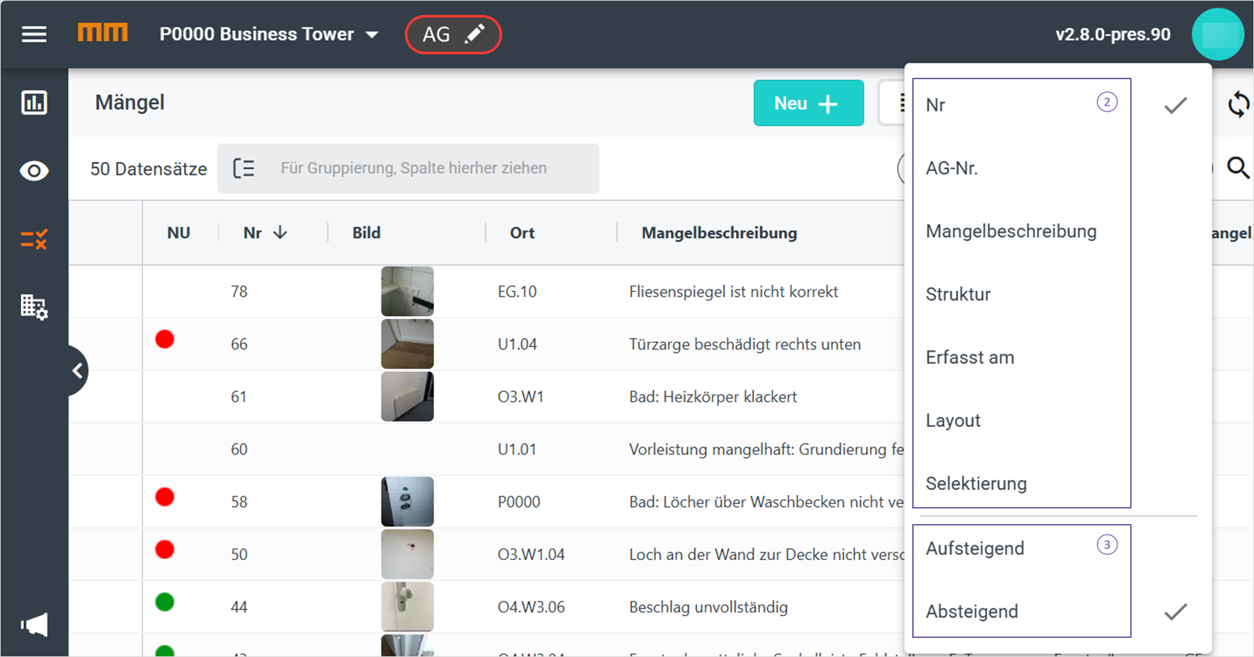 Über das Sortier-Icon (1) können Personen Mängel in der Listen- und Kachelansicht sortieren.