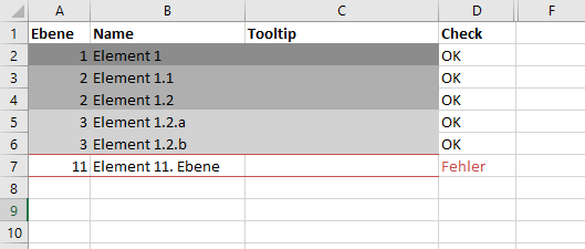 Mit folgendem Inhalt wird die Import-Vorlage ausgegeben. Dieses Beispiel zeigt zudem die Fehlermeldung, sollten mehr als 10 Ebenen angegeben werden.